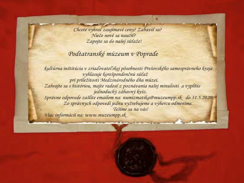 Poprad, 18.5.2020 Podtatranské múzeum v Poprade, pri príležitosti Medzinárodného dňa múzeí vyhlasuje korešpondenčnú súťaž – s názvom Hrajme sa s históriou – regionálne... Viac informácií |