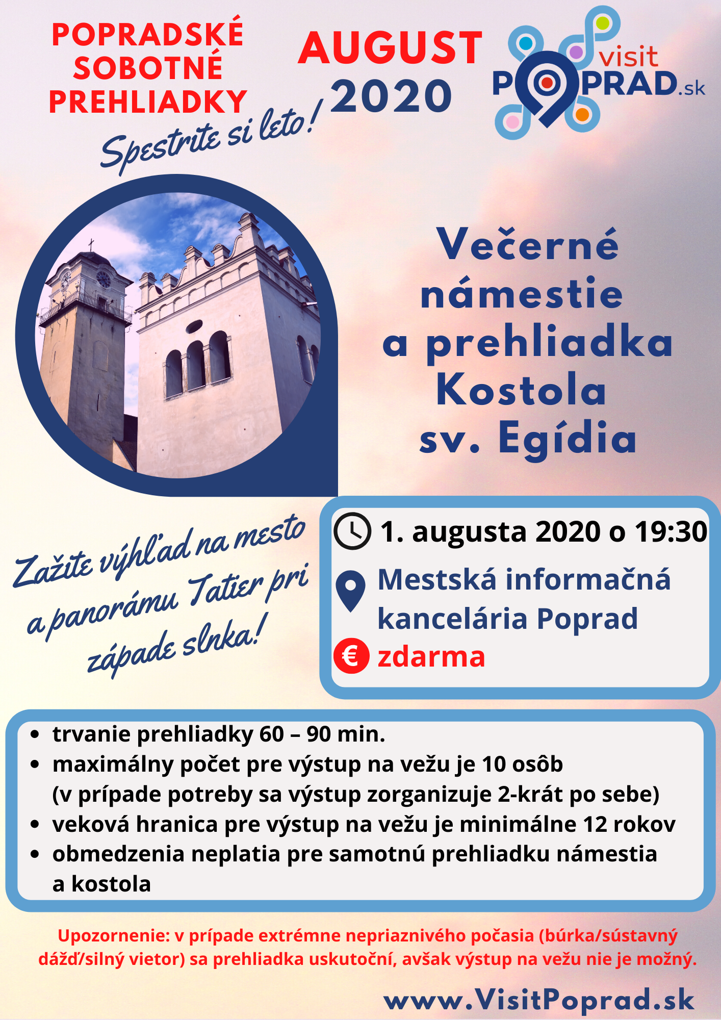 Mestská informačná kancelária Poprad Vás v rámci Popradských sobotných prehliadok pozýva na večernú prehliadku námestia a Kostola sv. Egídia s výstupom na vežu.